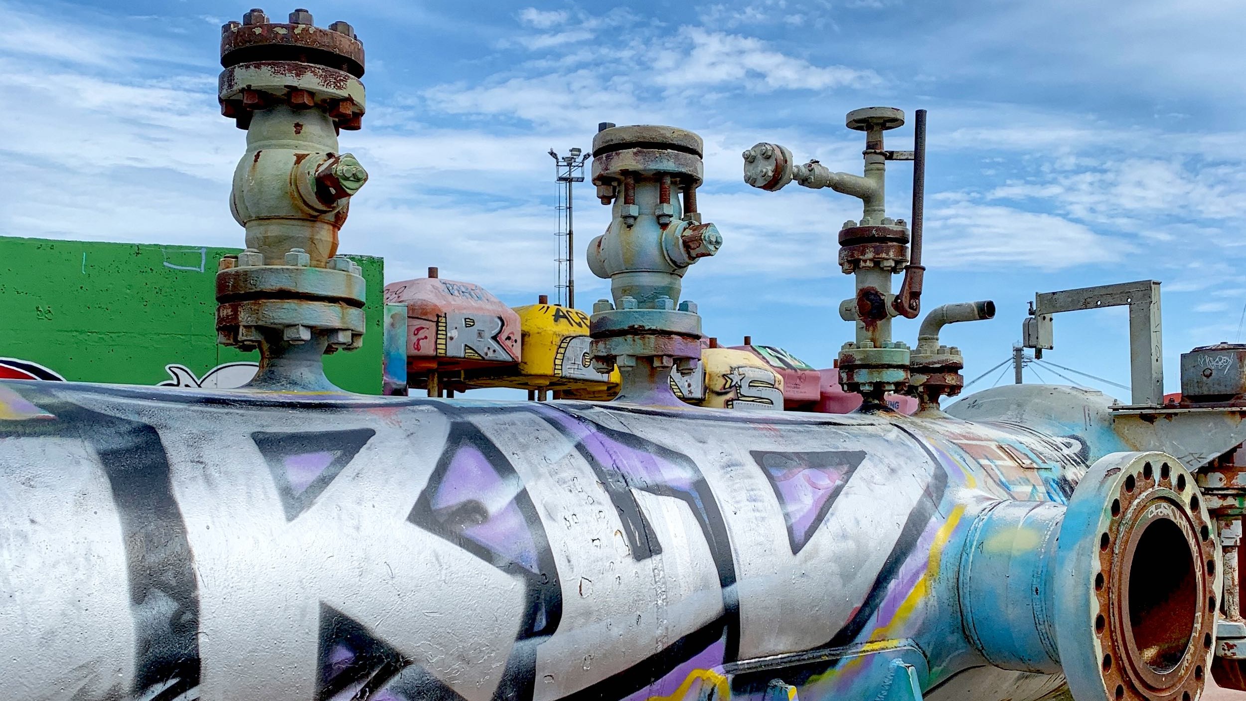Graffiti zieren auch den Geoparken, einen Spielplatz aus Relikten der Erdölindustrie wie Riesenbojen und Pipelines.