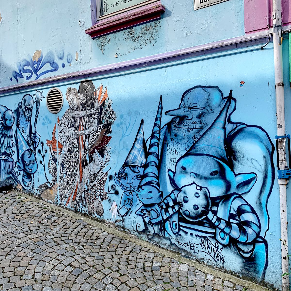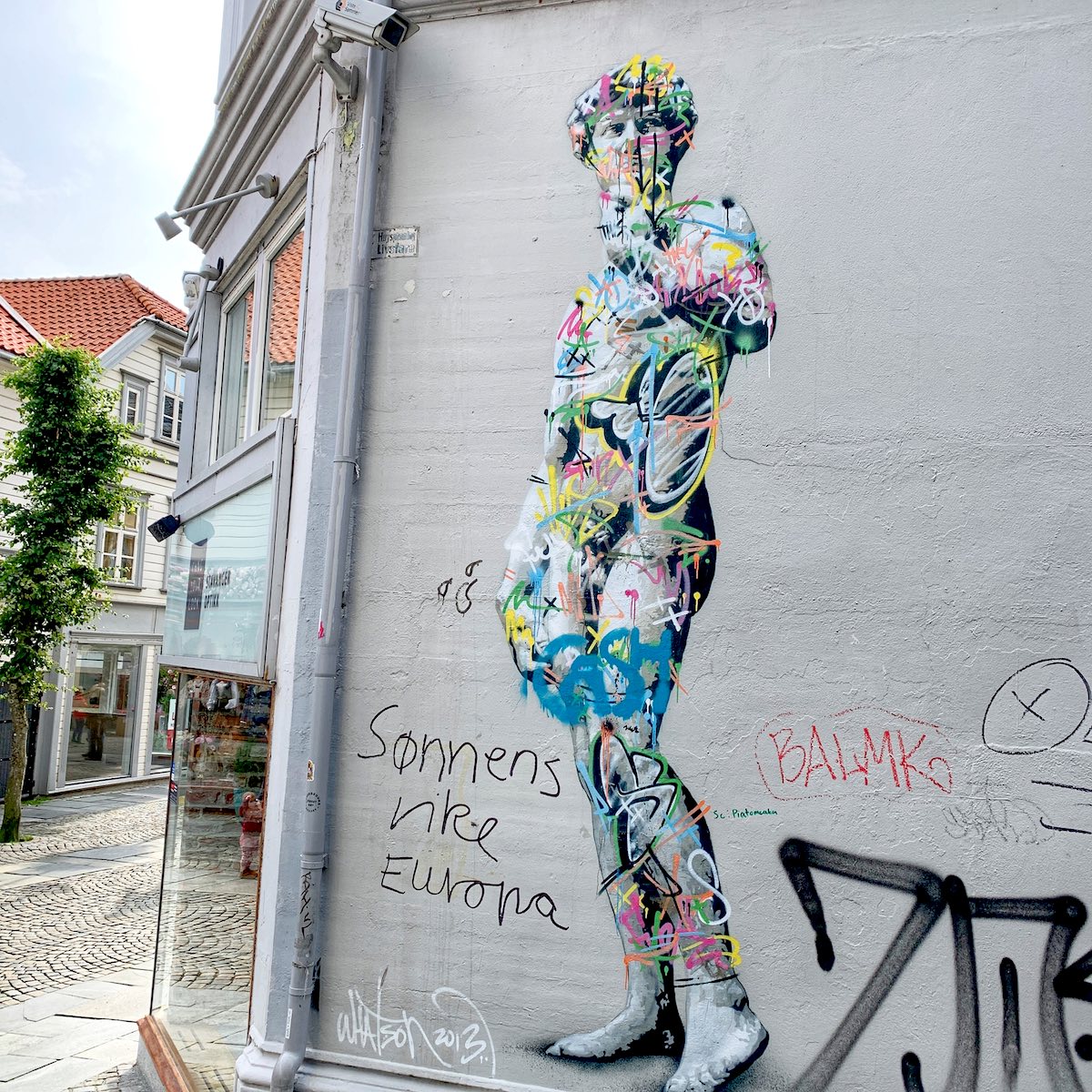 Auf der anderen Seite des Hafenbeckens Vågen warten einige der spannendsten Streetart-Arbeiten. Beiderseits der Breigata, in der Bakkegata, der Salvågergata, der Netlandsmauet und in der für ihre knallbunten Häuser bekannten Øvre Holmegate.