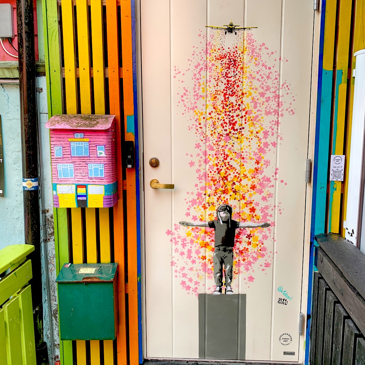 Die Fassade der dortigen Hausnummer 24 B versammelt gleich mehrere Werke des Norwegers Andreas Hamran Færø. Ein populäres Werk des berühmtesten Stencil-Artists des Landes ist «Grenade Lovers», außerdem zu sehen sind «Girl with Teddy» und «Heart Phone».