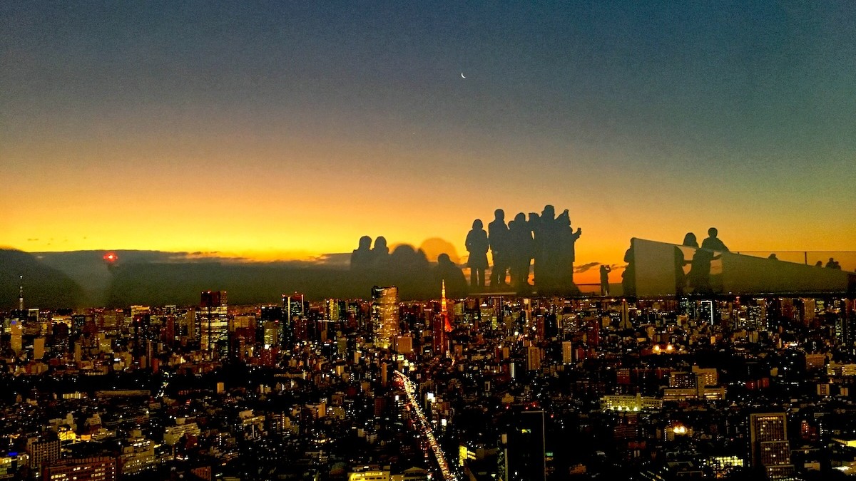 229 Meter über dem heißen Asphalt der berühmten Straßenkreuzung Shibuya Crossing befindet sich das Aussichts-Rooftop Shibuya Sky. Der Blick vom 47. Stock verschlägt einem die Sprache. Rund um den Wolkenkratzer erstreckt sich das fahlgraue Häusermeer bis zum Horizont. Beim Sonnenuntergang gerät die Kulisse ins Glühen, zum sporadischen Neonbunt mischen sich Gold- und Flammentöne.