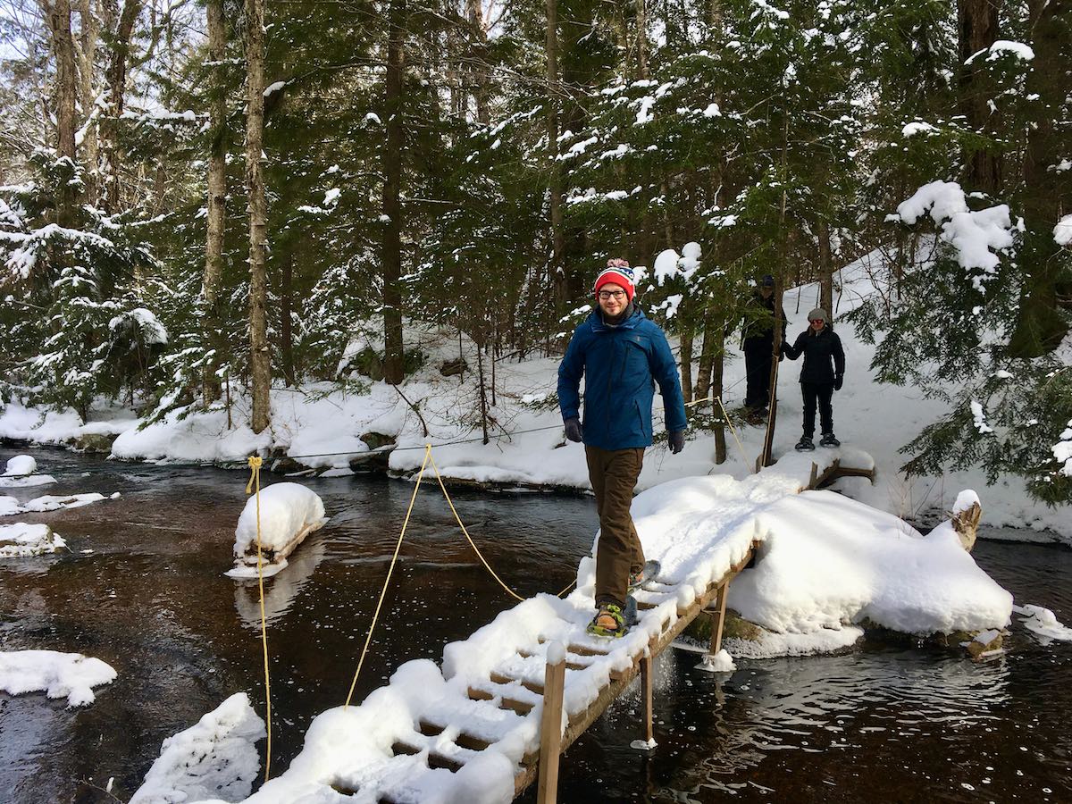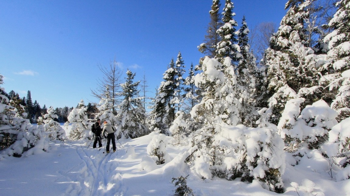So steht für uns Ontario-Erkunder tags darauf Backcountry Skiing an. Der Unterschied zum Langlauf? Statt in gespurten Loipen müssen wir uns diese mit den ausgeliehenen Latten selbst legen. Mauricio und Baris ziehen vorneweg, erst über den supernahen zugefrorenen Surprise Lake und dann zwischen verschneiten Bäumen und Büschen hindurch quer durchs Gelände, mal etwas rauf, mal etwas runter, durchaus auch mal über höhere Hügel.