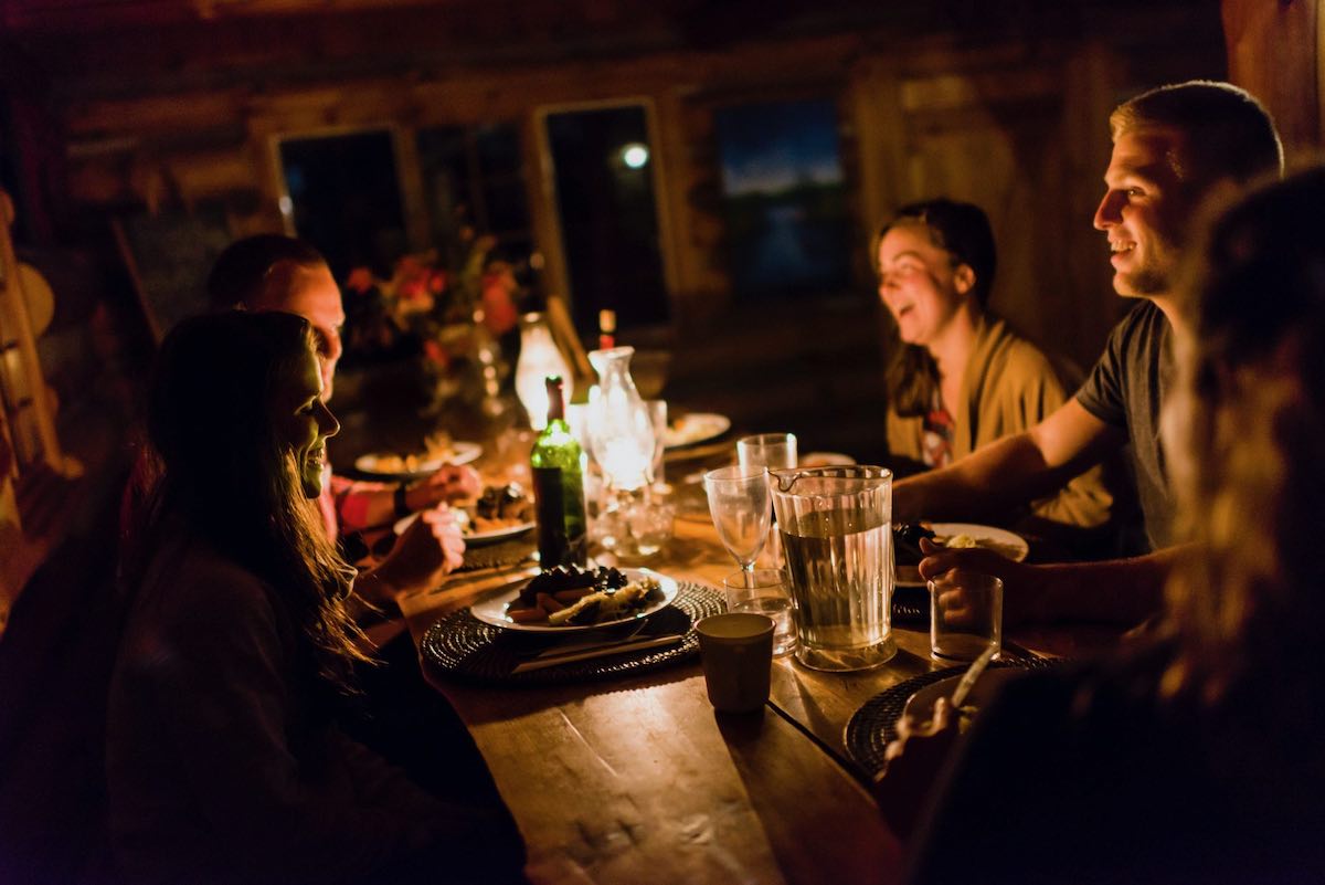 Ein hübscher Auftakt für das im Anschluss wartende köstliche Abendessen, das wir bei Kerzenschein in der Hütte zu uns nehmen. Wir kommen, Weingläser erhebend, zu dem Schluss: Fatbiken, Eisklettern, Schneeschuhwandern, Backcountry Skiing, Eisangeln – mehr Winter-Outdoor geht wirklich nicht in so kurzer Zeit. Denken wir. Denn gerade als es sich alle vorm Kamin gemütlich machen wollen, fordert uns Mauricio trotz abendlicher Stunde zu einer Runde Broomball auf.