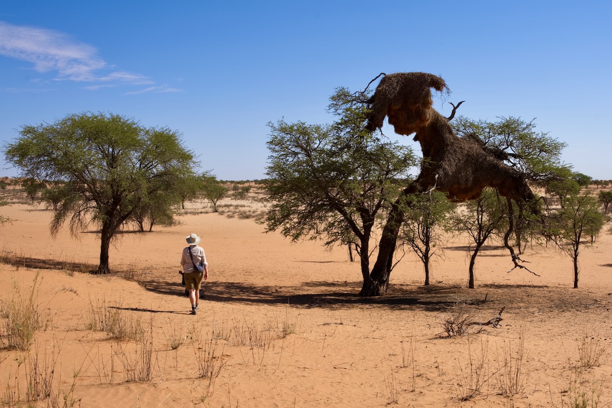 Alles weit weg vom Lodgebetrieb, mitten in den Dünen, mitten im Unendlichkeitsgefühl. Gestärkt geht es weiter, vorbei an Schirmakazien mit bis zu vier Meter breiten Webervogelnestern, die aussehen wie XXL-Naturkunst. «In einem Nest wohnen an die 200 Vögel, eine riesige und sehr soziale WG, bei der sich alle um die Nachbarn kümmern», so Etosha.