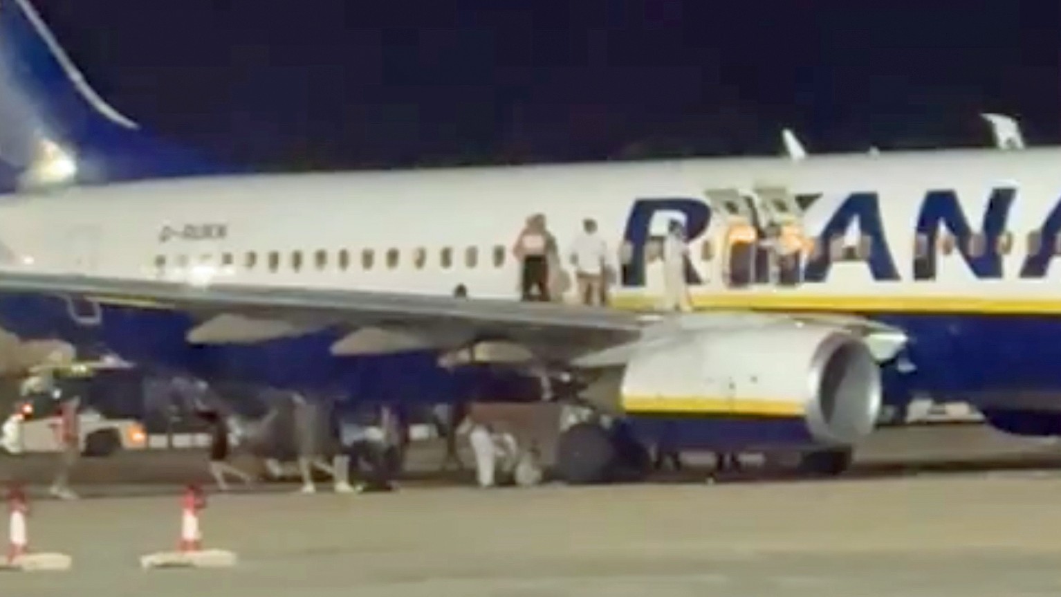Dies führte offenbar bei einigen zu Panik an Bord der Boeing 737 mit dem Kennzeichen G-RUKN. Während auf der linken Seite die Notrutschen ausgelöst wurden, flüchteten einige Reisende auf der rechten Seite auf die Tragfläche. Von dort sprangen sie aufs Vorfeld. was etwa einem Sprung aus etwas mehr als zwei Meter entspricht.