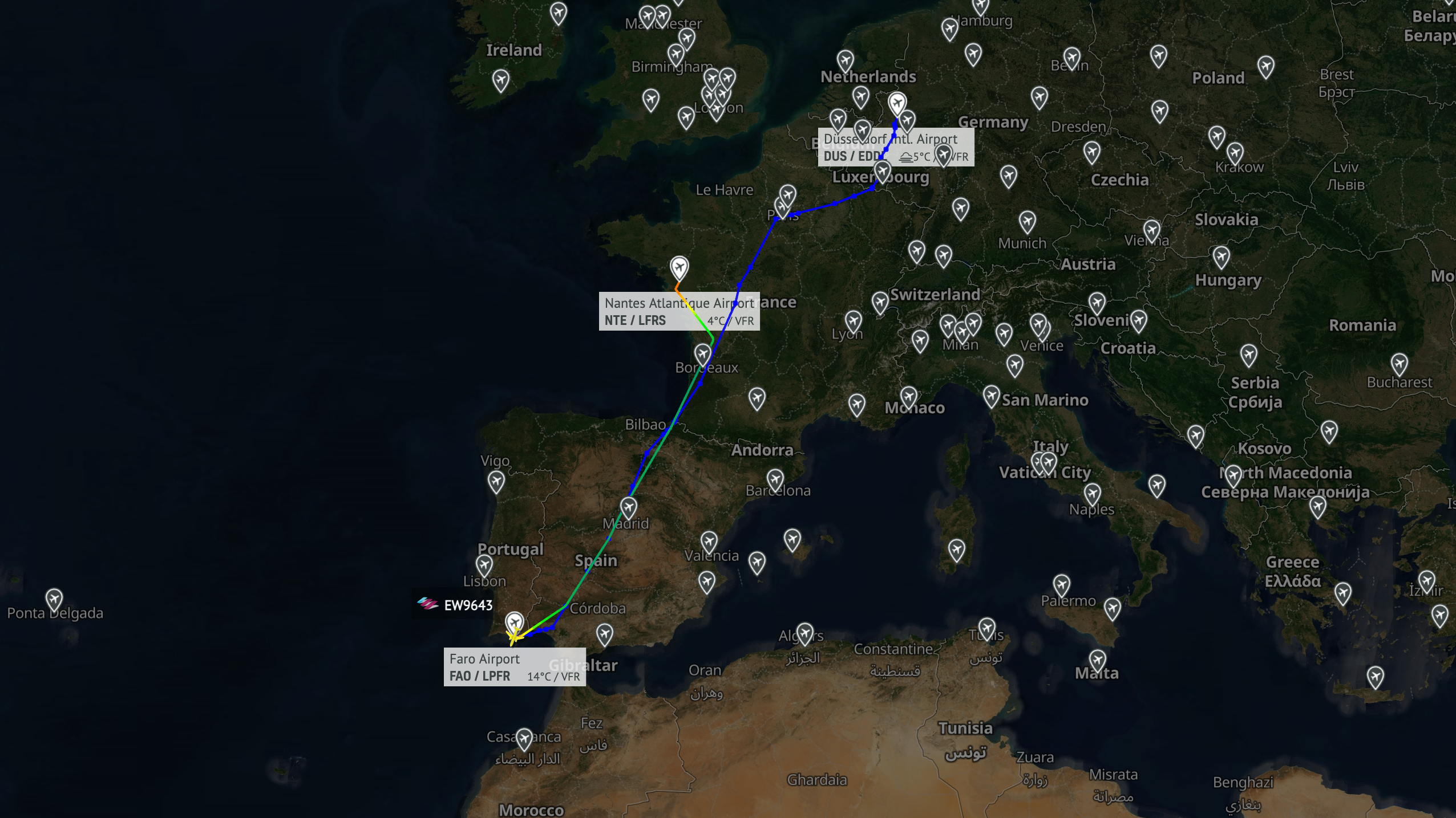 Eurowings-Flug EW9643 von Faro in Portugal nach Düsseldorf schaffte es am Mittwoch (26. November) nur bis Frankreich. Der 13 Jahre alte Airbus A321 wurde nach Nantes umgeleitet.