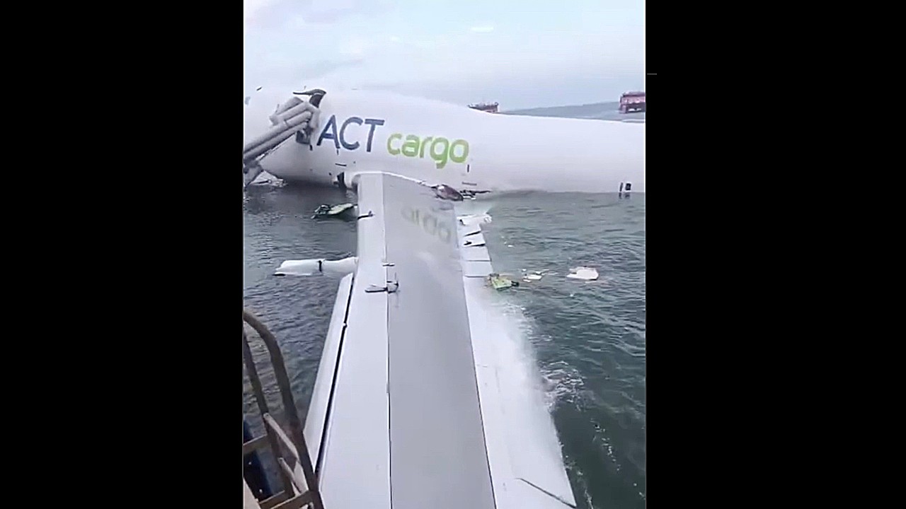 Der Rest des Jumbo-Jets liegt im Wasser. Die Nase ragt Richtung der Böschung der Nordpiste von Hongkong nach oben. Der hintere Teil liegt im Wasser. Im Bereich des Buges der Boeing 747 von Air ACT zeigen sich heftige Schäden. Offenbar wurden auch die Rutschen rechts aktiviert. Sie scheinen aber nicht mehr funktioniert zu haben.