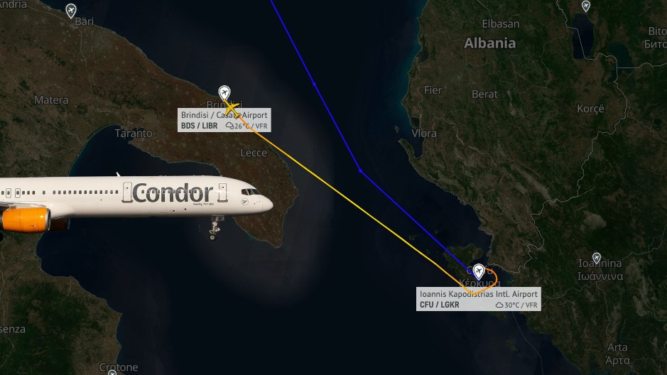 Condor-Flug DE3665 von Korfu nach Düsseldorf endete am Samstagabend (16. August) vorzeitig in Brindisi in Italien. Schon rund vier Minuten, nachdem die Boeing 757-300 von der griechischen Insel abgehoben war, wechselte die Cockpitcrew auf Transpondercode 7700 für einen Luftnotfall. 26 Minuten später erfolgte die Landung auf dem italienischen Flughafen.
