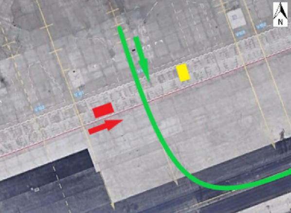 In Rot der Gepäckschlepper, in Gelb das Absperrfahrzeug, in Grün der Rollweg der Boeing 757. Google EarthTM, Bearbeitung BFU