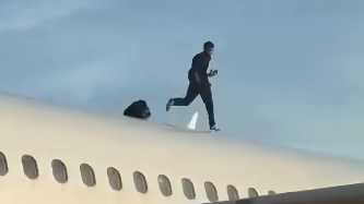 Ein Mann läuft wie ein Jogger, aber nicht etwa in einem Park oder an einer Straße entlang, sondern oben über den Rumpf eines Flugzeuges. «Er wird herunterfallen», fürchtet ein Beobachter der Szene, wie auf einem Video zu hören ist. In einer weiteren Aufnahme ist zu sehen, wie der Mann aus einer Dose oder Flasche trinkt, die er aus einem dunklen Rucksack nimmt, den er bei sich hat. Dann spuckt er vom Flugzeug und wirft das Gefäß schließlich herunter. Er gestikuliert auch immer wieder und scheint mit Leuten am Boden zu sprechen.