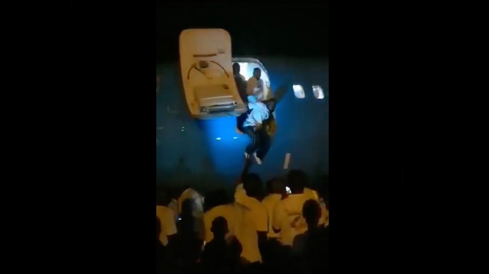 Viele Details zum Vorfall - so die Flugnummer und das Datum - sind nicht bekannt. Doch ein Video zeigt, wie einige Reisende tatsächlich aus dem Flugzeug von Air Congo springen, andere lassen sich zuerst von der Türschwelle nach unten hängen, um sich dann von dieser geringeren Höhe auf das Vorfeld hinabzulassen. Angestellte des Flughafens stehen mit Taschenlampen immerhin helfend vor dem Jet herum. Es herrscht ein riesiges Stimmengewiir.