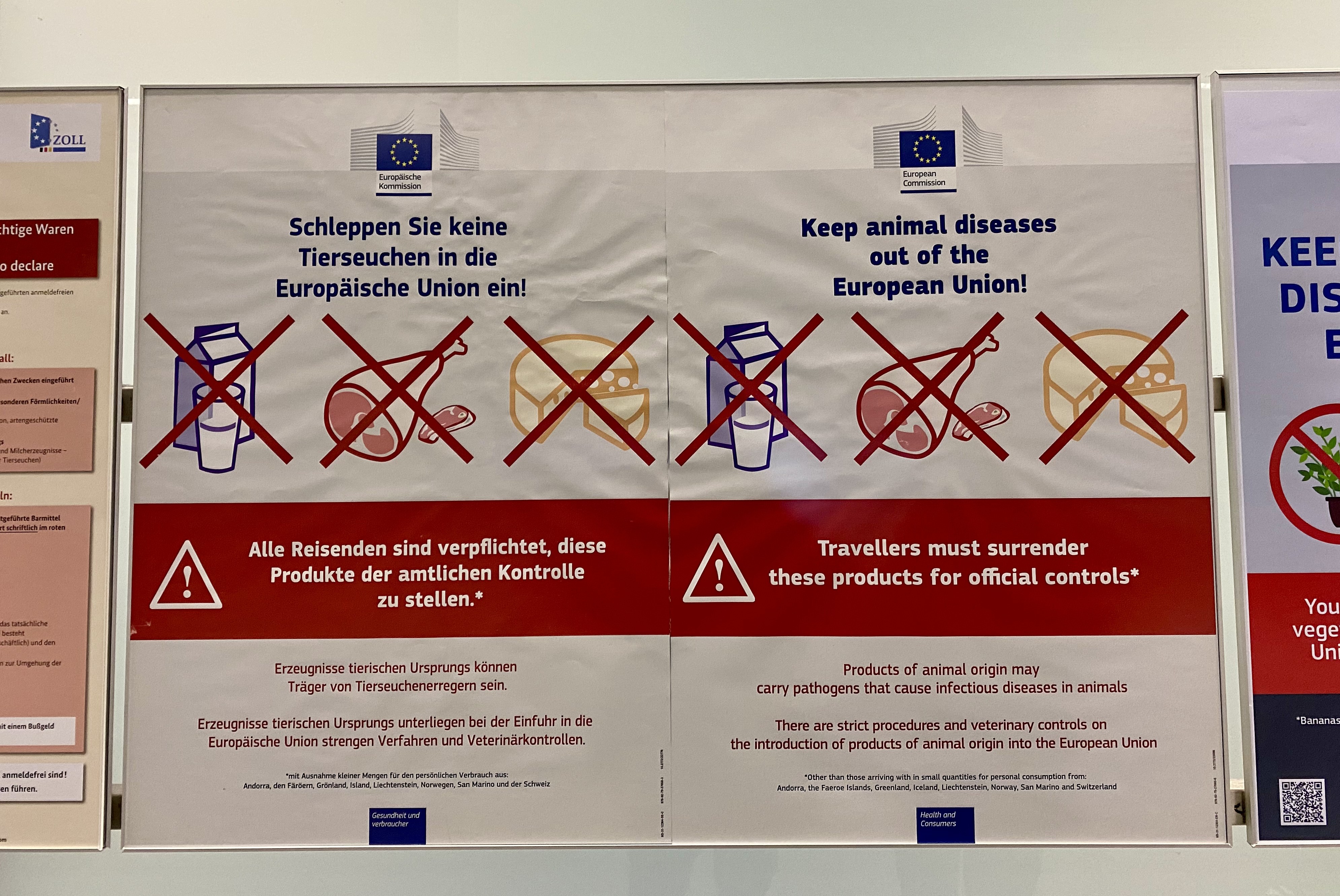 «Schleppen Sie keine Tierseuchen in die Europäische Union ein» - so steht es auf Plakaten der EU, die in den Ankunftsbereichen europäischer Flughäfen hängen. Zu sehen sind dazu Abbildungen von Milch, Fleisch und Käse, jeweils durchgestrichen. «Alle Reisenden sind verpflichtet, diese Produkte der amtlichen Kontrolle zu stellen.» Ausnahmen gibt es nur bei Einreisen aus Andorra, den Färöer, Grönland, Island, Liechtenstein, Norwegen, San Marino und der Schweiz, und auch dann nur bei kleineren Mengen für den persönlichen Gebrauch.