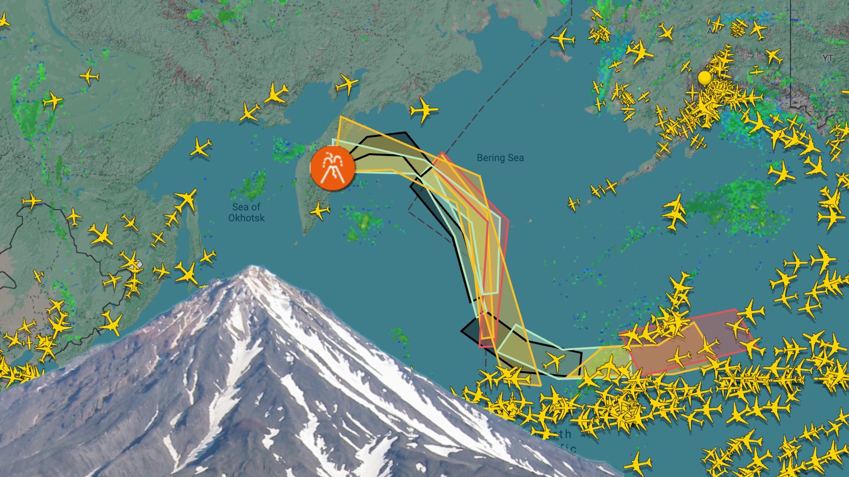 Flugzeuge fliegen daher Umwege, um die Aschewolken zu vermeiden. Flugverfolgungsportale zeigen an, in welche Richtungen sich die Asche ausbreitet. Beim aktuellen Klyuchevskoi-Ausbruch bewegt sie sich von Kamtschatka aus stets nach Osten, am 9. August zusätzlich nach Süden, am Montagmorgen (11. August, Mitteleuropäische Sommerzeit) stattdessen zusätzlich nach Norden. Entsprechend fallen die Flugrouten und ihre Anpassungen aus.