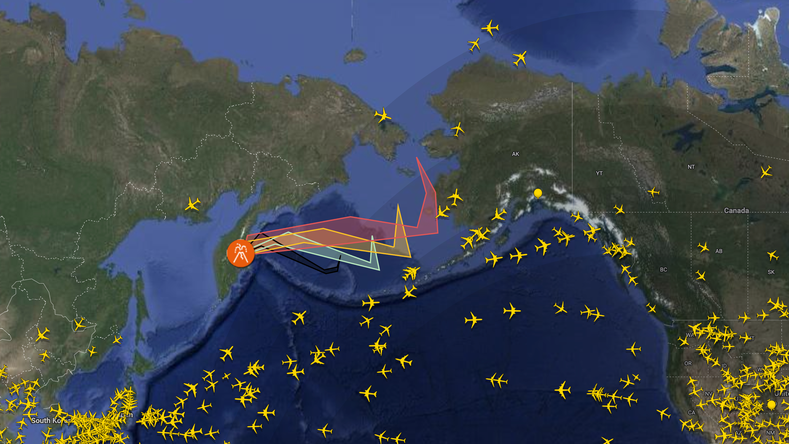 Ein Beispiel ist Japan-Airlines-Flug JL6 von Tokio nach New York. Normalerweise verläuft er - noch am 8. August zu sehen - von Japan aus nach Nordosten, führt vorbei an Kamtschatka, über St. Lawrence Island und erreicht etwa bei Nome in Alaska nordamerikanisches Festland. Weiter geht es über Kanada und dann südöstlich bis New York.