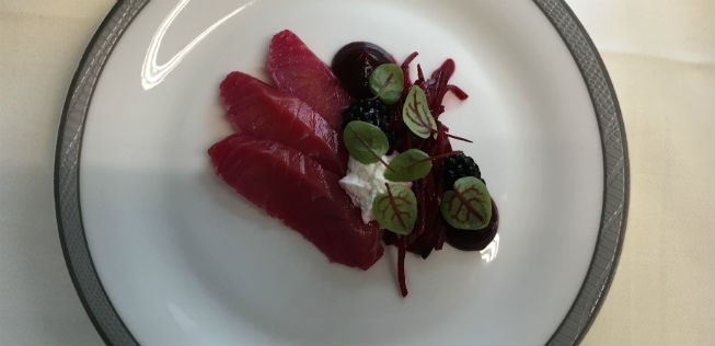 Auf dem Menu steht dann zum Beispiel das Gericht «Sashimi vom Lachs mit Rote Bete, Brombeere, Meerrettich und Pastinaken», «Rinderfilet mit Bärlauchkruste, gegrilltem grünem Spargel, Wildkräuter-Tomatensauce und Gänselebersauce» oder «Schweizer Stör mit Schweizer Alpenkaviar mit Gurke, Quinoa, Raps und Lauchcrème». Entwickelt hat sie der 32-Jährige Schweizer Sternekoch Dennis Puchert.