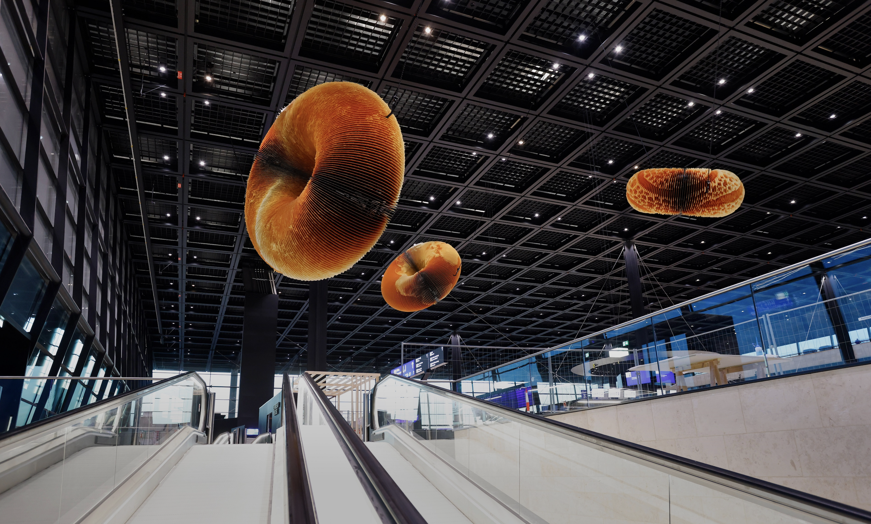 Die Installation besteht aus drei ringförmigen Skulpturen, sogenannten Tori, die einzeln unter der 18 Meter hohen Hallendecke schweben. Mit Durchmessern von drei, fünf und sieben Metern und Gewichten von über ein, zwei und drei Tonnen zählen sie zu den größten Kunstobjekten im öffentlichen Bereich des Airports. Gefertigt aus 636 eingefärbten Aluminiumscheiben, zeigen die Oberflächen unter anderem die Topografie der Erde. Die Tori und sogar ihre einzelnen Scheiben sind motorisch beweglich – das Werk verändert sich permanent.